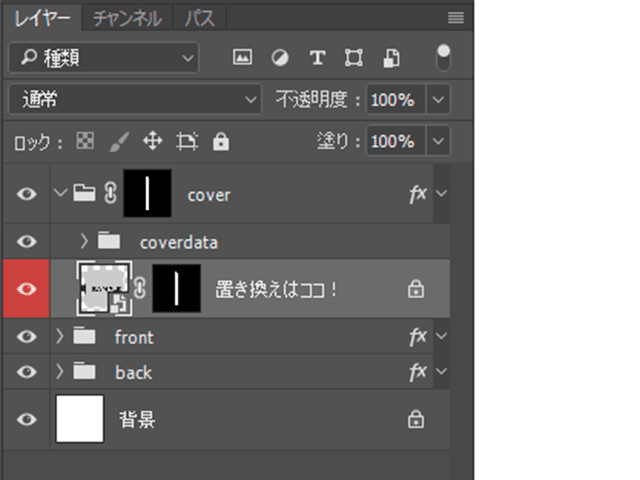 レイヤーには「cover(背表紙)」「front(帯側)」「back(カメラ側)」というグループ3つがあり、「置き換えレイヤー」というデータがあればOKです。