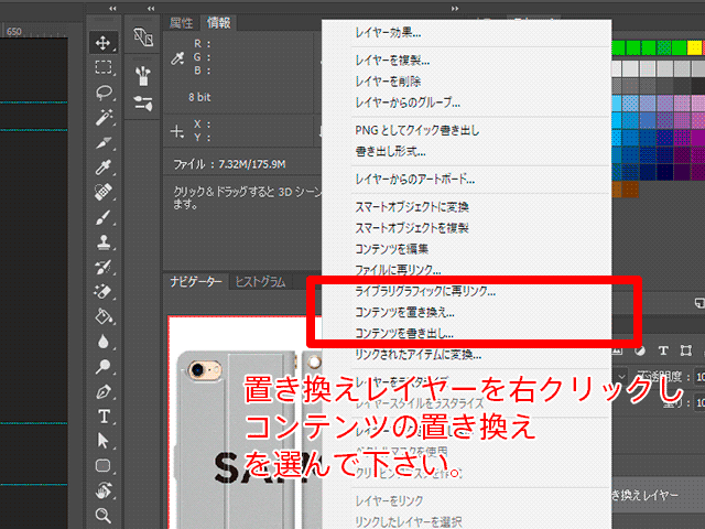 表面のレイヤーを開いて、「置き換えレイヤー」を右クリックして、上から13番目前後(CCの場合)にある「コンテンツを置き換え」をクリックします。