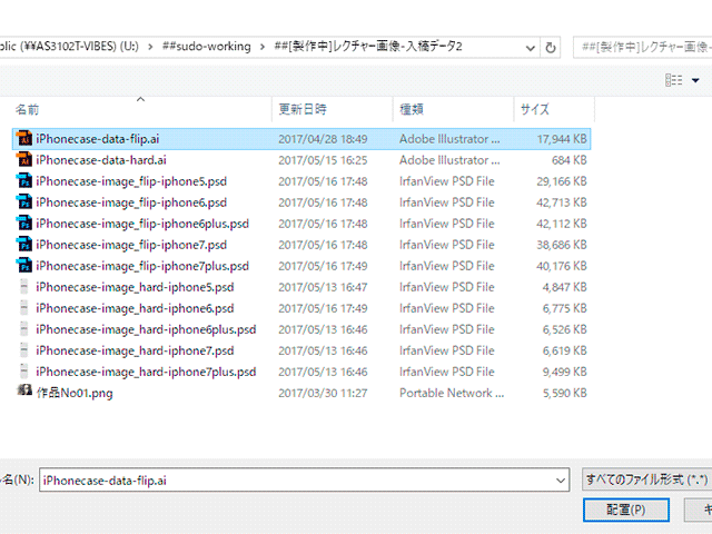 するとファイルを選ぶ画面が出てきますので、今回作ったAIデータの「iPhonecase-data-flip.ai」を選択し、「配置」のボタンを押して下さい。