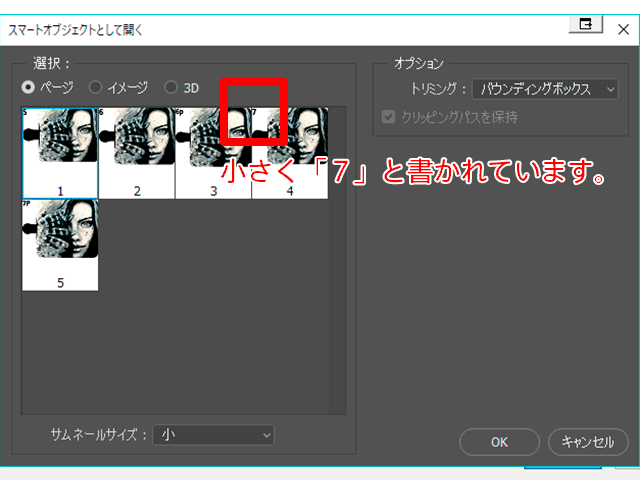 PSDファイルにAIを読み込むため、「スマートオブジェクトとして開く」という画面が開きます。その左から4番目にある小さく7と書かれた画面を選択し、OKを押して下さい。
