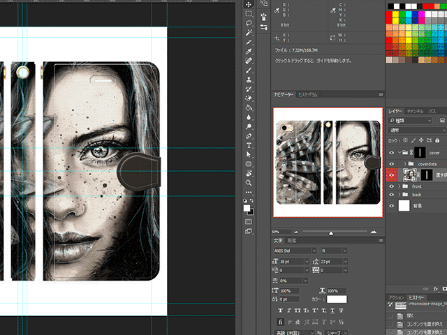 PSDファイルは機種ごとに別れています。先ずはiPhone7 手帳型用データの「iPhonecase-image_flip-iphone7.psd」を開いて下さい。