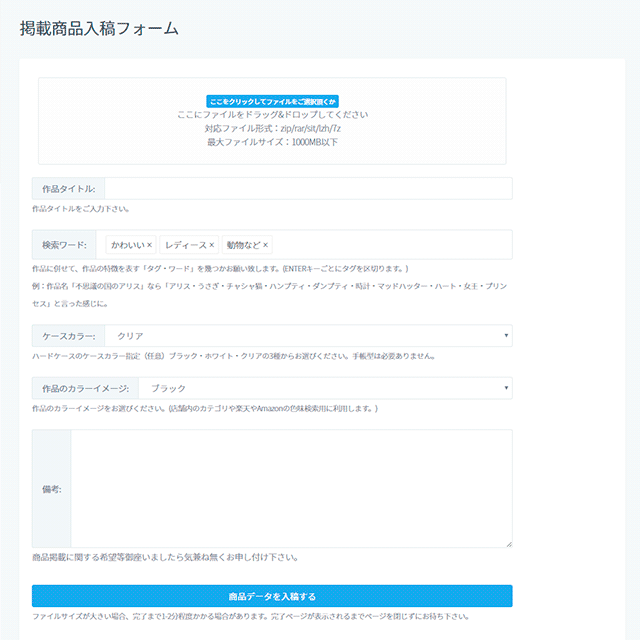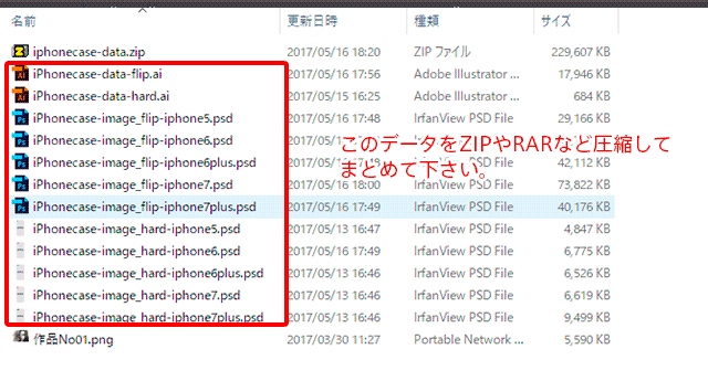 入稿は「作品入稿フォーム」へのアップロードで行います。先ずは先ほど作ったiPhoneケースのAIとPSDデータを圧縮ソフトでZIPなどにひとまとめにしてください。